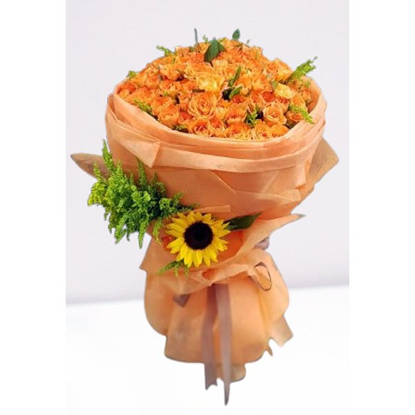 101 adet turuncu gül ve çeşitli aksesuarlar kullanılarak hazırlanmıştır.