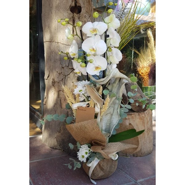 2 dal beyaz orkide,papatyalar ve çeşitli aksesuarlar kullanılarak hazırlanmıştır.