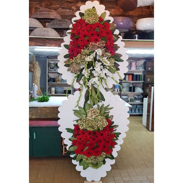 60 adet kırmızı gerbera, ortanca ve glayör kullanılmıştır