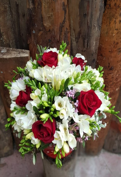5 adet kırmızı gül ve çeşitli aksesuarlar kullanılarak hazırlanmıştır.