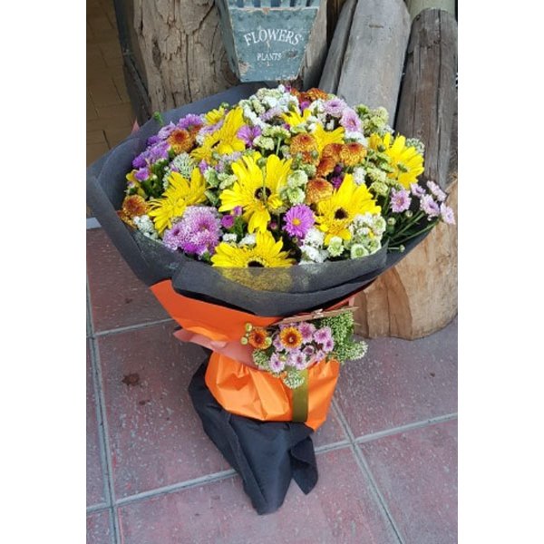 8 adet sarı gerbera, renkli krizantemler ve çeşitli aksesuarlar kullanılarak hazırlanmıştır.
