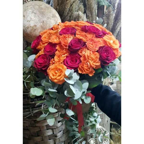40 adet turuncu gül ve çeşitli aksesuarlar kullanılarak hazırlanmıştır.